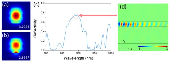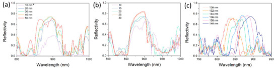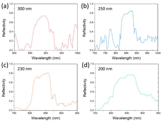 The photonic integration is going towards high density, requiring reduced dimensions of photonic components. As the nanowire diameter decreases to the limit of fundamental modes, the reflectivity decreases dramatically, together with the threshold gain. The metal grating reflector is more meaningful for nanowires with smaller diameters. The reflected spectra for nanowire diameters of 300 nm, 250 nm, 230 nm, and 200 nm are shown in Figure 4, where the other structural parameters of the grating height, duty cycle and period number are the same. The grating period or width are slightly tuned, to keep the spectra within the gain spectrum of the GaAs nanowire. The bandwidth and intensity of the reflection spectrum have negative relationships with the diameter, due to the index contrast increasing with the decreasing diameter. As the diameter decreases, the electromagnetic wave guided inside the nanowire has a more intense interaction with the metal grating tooth, resulting in a larger modal effective index, together with index contrast.