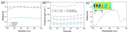 To compare the reflection between the Ag grating, end facet, and Au cap, functions of the Ag-grating reflectivity, end-facet reflectivity and Au-cap reflectivity on nanowire diameter are depicted in Figure 5a. The end-facet reflection is very weak and gets weaker for diameters of 200 nm and 220 nm. At a diameter of 200 nm, the end-facet reflectivity is below 30%. In contrast, for the Au-cap reflection, it is very strong even at a diameter of 200 nm. Its reflectivity can be 80% at larger diameters, and more than 65% at a diameter of 200 nm. Thus, the Au cap can provide excellent reflection for the propagated light wave with extremely small dimensions. This can be an additional advantage of the Au-catalyst growth method. For the reflection of the Ag grating, it is much stronger than the end-facet reflection. Its reflectivity is two times larger than its end-facet reflectivity. For small nanowire diameters below 260 nm, the reflectivity of Ag grating is even greater than Au-cap reflectivity. The introduction of the metal grating reflector is to compensate for the end-facet reflection, resulting in the reduced nanowire length or lowered threshold gain. The lasing threshold is the lowest excitation level, at which laser output is dominated by stimulated emission rather than spontaneous emission. The threshold gain , which describes the required gain per unit length for lasing, is defined as [27]