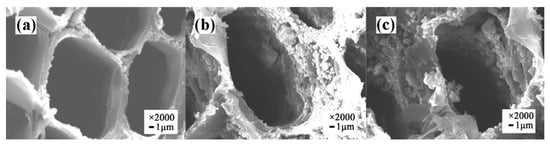 Field emission scanning electron microscopy (FESEM) of (a) original wood, (b) UW, and (c) VW.