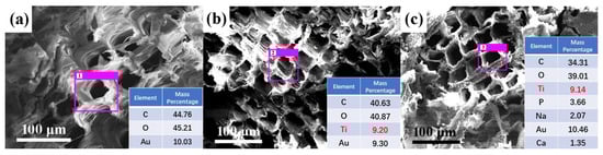 Energy-dispersive spectroscopy (EDS) of (a) original wood, (b) UW, and (c) VW. Data pertain to the selected area within the pink boxes.