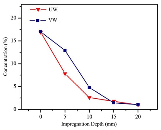 Anti-mold wood might be cut from the surface material during subsequent processing into wood products. Therefore, by exploring the impregnation depth and distribution of Ag/TiO2 nanoparticles in wood, we can determine the anti-mold properties of Ag/TiO2 wood-based nanocomposites in practical application. Figure 4 shows the mass fraction of Ag/TiO2 at the longitudinal depth of the wood. The longitudinal distribution of Ag/TiO2 in the different woods was quite different. A large number of nanoparticles were concentrated on the wood surfaces. With an increase in longitudinal depth, the mass fraction of Ag/TiO2 decreased. At 20 mm away from the surface, the mass fraction of Ag/TiO2 in UW was 1.05%, and that of VW was 0.97%. The minimum anti-mold concentration of Ag/TiO2 was 0.125%. At a depth of 20 mm, the concentration of Ag/TiO2 was eight times higher than that of the minimum anti-mold concentration and still had good anti-mold properties [,]. Therefore, processing had little impact on the mold-proof performance and anti-mold properties of the wood.