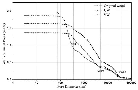 Total volume of pores vs. the pore diameter of original wood, UW, and VW.