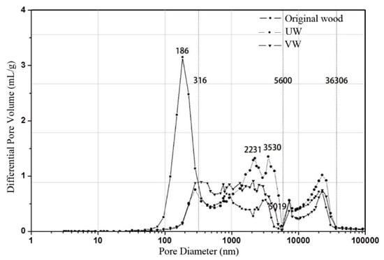 Differential pore volume vs. pore diameter of original wood, UW, and VW.