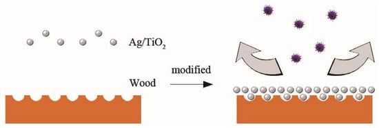 Wood is widely used in many applications due to its excellent material properties and renewable nature. However, wood is susceptible to mold infection in wet environments. Dense mold spots not only affect the aesthetic and decorative functions of wood but also reduce its mechanical properties [,]. Long-term contact with moldy wood and inhalation of its spores can cause allergies, respiratory inflammation, and mucosal disease [,,]. In recent decades, the study of anti-mold treatments for wood has attracted much attention [,,,,]. Compared with traditional organic anti-mold agents, inorganic agents have attracted more attention due to their unique features, such as earth-abundance, chemical-stability, and low-cost [,]. Nano-Ag/TiO2 is recognized as one of the best inorganic anti-mold agents [,]. Ag nanoparticles can significantly enhance the photocatalytic activity of TiO2 by restraining the recombination of electron-hole pairs, which can lead to the improvement of the anti-mold effect of TiO2 under natural light, weak light, and dark conditions [,]. Furthermore, nano-Ag has synergistic anti-mold effects with TiO2 due to its own anti-mold abilities []. However, after doping with Ag, the enhanced polarity of TiO2 makes it easier to agglomerate [,,].