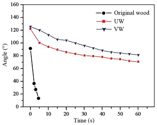 Water contact angles of (a) original wood, (b) UW, and (c) VW.
