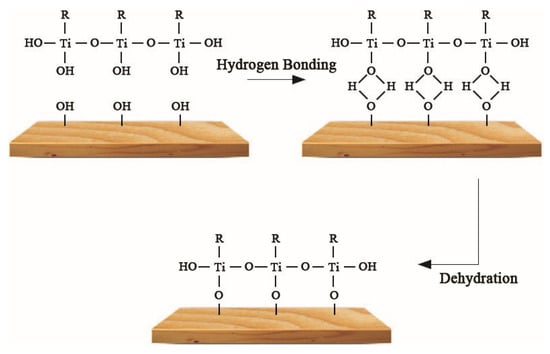 Water is the main component of mycobacterium and the medium by which fungi invade wood. Most fungi are able to grow when the moisture content of wood is 35–60%, but when the moisture content is less than 20%, the growth of fungi is inhibited. The equilibrium moisture content (EMC) of the original wood, UW, and VW are shown in Table 4. The results show the EMC of UW and VW was lower than that of original wood under the same humidity conditions, indicating the hydrophobic performance of UW and VW was significantly improved and the low moisture content of the wood-based nanocomposites was able to improve the anti-mold effect. The Ag/TiO2 nano-hydrophilic hydroxyl on wood fibers was associated with hydrogen bonding; the decrease of hydroxyl functional groups promotes the increase of wood hydrophobicity. Meanwhile, as shown in Figure 10, KH560 in the compound modifier introduced hydrophobic base head alkanes to further prevent water from entering the wood [,].