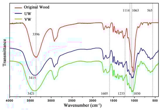 Fourier transform infrared spectroscopy (FTIR) of original wood, UW, and VW.