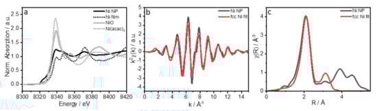 (a) Normalized Ni K-edge XANES-spectra of NiNPs (black straight), a Ni film (black dots), NiO (grey straight), and Ni(acac)2 used as precursor (grey dots); (b) visualization of k2-weighted extended X-ray absorption fine structure (EXAFS) oscillations in k-space of NiNPs (black) and fcc Ni bulk fit (red); (c) EXAFS oscillations as a function of the distance R obtained by Fourier transformation of NiNPs (black) and fcc Ni bulk fit (red).