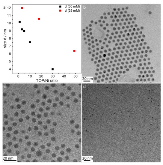 - Amount of stabilizer: The influence of the 1–50 TOP:Ni ratio was investigated using the following method based on SAXS data, which are shown in Figure S3. Two different concentrations (25 and 50 mmol/L) of Ni(acac)2 were tested. Increasing the TOP concentration resulted in both cases of decreasing particle sizes (Figure 5a). The decrease in particle size was steeper for the 50 mmol/L Ni(acac)2 concentration. TEM images revealed spherical particles narrowly distributed, well-separated, and arranged into two-dimensional networks due to the effective stabilization by TOP (Figure 5b–d). Upon increasing the TOP/Ni ratio to 30, smaller nanoparticles were formed in a significant amount, which were still well-separated but no longer formed networks.