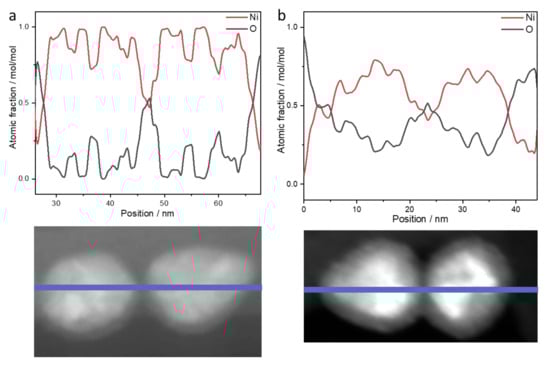 - Long-term stability of the nanoparticles: NiNPs prepared with 50 mmol/L Ni(acac)2, TOP/Ni = 3, and OAm/Ni = 61 for 2 h at 220 °C were investigated using STEM and EDS. Figure 6 shows the distribution of elements (line scan indicated by blue line, K-lines) of nickel and oxygen on the nanoparticles two weeks after synthesis (Figure 6a) and after nine weeks of storage (Figure 6b) on the TEM grid. The expected distribution of nickel within the NiNPs is aligned with the contrast differences in the STEM image. Due to the lower local concentration after synthesis, the oxygen distribution around the nanoparticles demonstrates the ongoing oxidation process on the particle surface by showing higher intensities at the outer regions of the particles and less intensity at the inner regions of the particles. The overall atomic fraction of nickel in the particles decreases over time, indicated by a maximum amount of 100 mol/mol in the fresh nanoparticles in comparison to a maximum of 80 mol/mol in the altered particles. The carbon distribution is not analyzed in the line scan, as it shows strong intensities around the particles assignable to the lacey carbon film on the used copper TEM grid, but it is shown in the mapping image (Figure 7 left). The phosphorus distribution confirms the presence of stabilizer TOP on the particle surface leading to well-separated and organized nanoparticles.