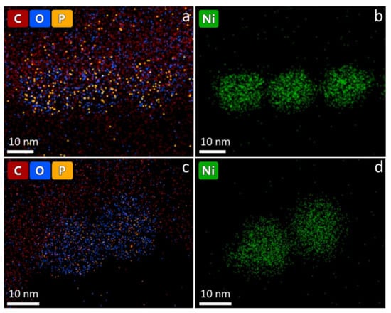 Figure 7. EDS mapping of NiNPs after synthesis: (a) Element distribution of carbon, oxygen, phosphorus, and (b) nickel. EDS mapping of NiNPs after nine weeks storage in air: (c) Element distribution of carbon, oxygen, phosphorus and (d) nickel.