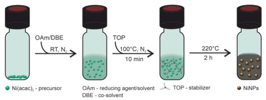 Materials: Oleylamine (OAm, Acros, Geel, Belgium, C18-content 80–90%), trioctylphosphine (TOP, Sigma Aldrich, Karlsruhe, Germany, 90%), nickel(II) acetylacetonate (Ni(acac)2, Acros, Geel, Belgium, 96%), dibenzyl ether (DBE, Acros, Geel, Belgium, 99%), and n-hexane (Chemsolute, Renningen, Germany, 99%) were all used as received.