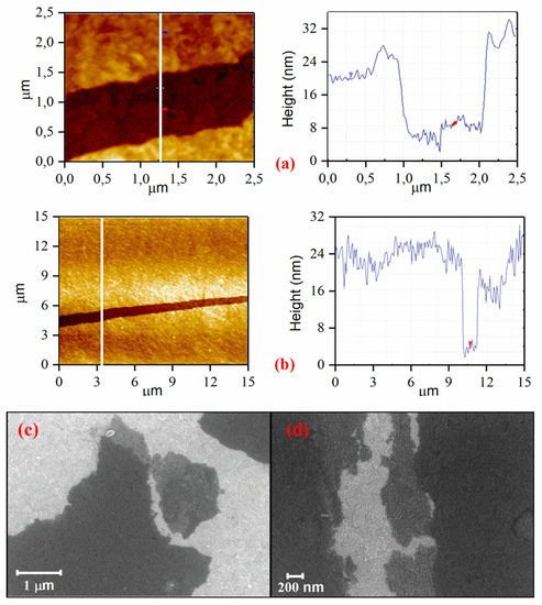 Figure 3. Atomic force microscopy (AFM) images and corresponding cross-sections (a,b), and SEM (c,d) images of hybrid rGO–PbS LB film.