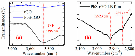 Figure 5. FTIR spectra of rGO–PbS hybrid indicating the O-H mode typical for rGO (a). FTIR spectra of rGO–PbS LB film indicating the traces of oleic acid on QD surface (b).