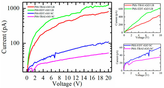 However, insulating oleic acid ligands on the PbS QD surface for a long time prevents effective charge transfer between the QDs and must be removed during optoelectronic device fabrication. To perform post-deposition ligand exchange, the films were placed on a spin-coater, with TBAI and EDT treatments performed. The quality of the films remained perfect after the exchange procedure (Figure S6). As a reference, we made two films with a similar thickness from the rGO–PbS solutions, using the spin-coating technique, and performed a similar ligand exchange procedure. For conductivity measurements, a 2-mm stripe was etched on an ITO surface on this series of samples to perform the analysis. The current–voltage characteristics (I–V curves) are obtained for EDT- and TBAI-treated samples, prepared using the LB and spin-coating techniques, as shown in Figure 6.