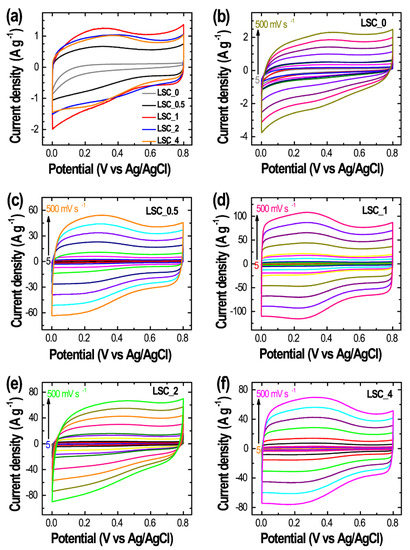(a) Cyclic voltammetry (CV) curves of all the samples at a constant scan rate of 5 mV s−1, and the corresponding CV curves at different scan rates from 5 to 500 mV s−1. (b) LSC_0, (c) LSC_0.5, (d) LSC_1, (e) LSC_2, and (f) LSC_4.