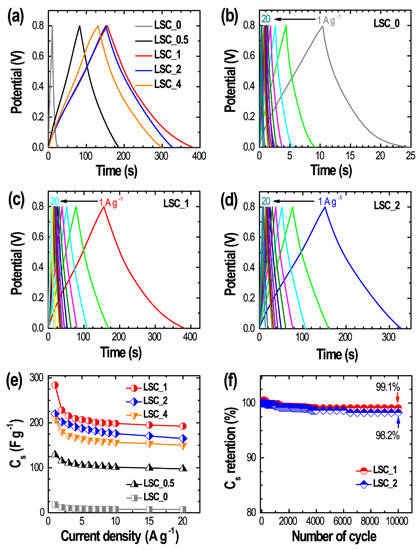(a) Galvanostatic charge–discharge (CD) profiles of all the samples at a constant current density of 1 A g−1, (b) CD curves of LSC_0, (c) LSC_1, and (d) LSC_2 at different current densities from 1 to 20 A g−1 as typical examples. (e) Specific capacitance as a function of current density for all the samples, and (f) cycling performances of LSC_1 and LSC_2 electrodes up to 10,000 charging–discharging cycles.