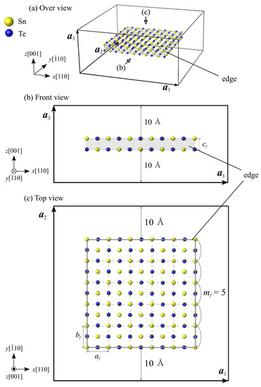 We perform first-principle, density-functional theory (DFT) calculations [22,23]. The effects of nuclei and inner shells are expressed by the project-augmented wave (PAW) method [24,25], and the Sn 4d, 5s, 5p orbitals and the Te 5s, 5p orbitals are explicitly treated as valence electrons. The electronic wave function is expanded in plane-waves, and the cutoff energy of the plane waves is set to 450 eV. The Brillouin zone integration is performed using a 10 × 1 × 1 Monkhorst-Pack k-point mesh for the nanoribbon models and a 1 × 1 × 1 k-point mesh for the nanoflake models [26]. The PBE-D3 functional is used for the evaluation of the exchange correlation term [27]. The stable structure is determined by relaxing atomic positions using the conjugate gradient method until the force acting on the atoms became 1.0 × 10−3 eV/Å or less. All the first-principles calculations are performed using the Vienna Ab-initio Simulation Package (VASP) code [28,29]. The present calculation condition was confirmed to reproduce the electronic (band structure) and ferroelectric properties of SnTe monolayer via the comparison of experimental data [18].