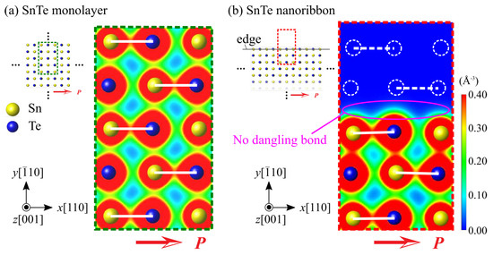 Considering the above discussion on the conventional ferroelectrics, here we investigate the absence of a critical ferroelectric size of SnTe nanoribbons in terms of factors (I) and (II). Considering factor (I), the ferroelectric polarization direction of the SnTe nanoribbon is almost parallel to the edge line, and thereby, no surface polarization charge is induced and no depolarization field is generated. Therefore, the electrostatic factor (I) due to the depolarization field does not occur in SnTe nanoribbons. Next, the dangling bond formation at the edge of the SnTe nanoribbon is examined to consider factor (II). Here, we first refer the bonding structure of the SnTe monolayer (i.e., without dangling bonds) as a reference, as shown in Figure 5. In the SnTe monolayer, spontaneous polarization P appears in the [110] direction due to the relative displacement of Sn2+ ions in the [110] direction with respect to Te2− ions in the ferroelectric phase (see Figure 5a). Due to the ionic displacement, the SnTe monolayer forms an Sn-Te bond along the [110] direction, which is the same as the direction of spontaneous polarization. This means that the relative displacement and bonding of the Sn2+ and Te2− ions in the [110] direction in the SnTe monolayer corresponds to the spontaneous polarization and, thereby, is a characteristic of the ferroelectric manifestation of the SnTe monolayer. Figure 6 compares the bonding situation between in the SnTe monolayer and the SnTe nanoribbon. The white lines in the figure indicate Sn-Te bonds, while the white dashed circles and lines in the SnTe nanoribbon indicate the imaginary Sn or Te position and bond, respectively, which were formed in the SnTe monolayer. As described above, the SnTe monolayer forms an armchair-shaped Sn-Te bond along the [110] direction (see Figure 5b-2), and this situation can be seen alternately appearing on the Sn-Te bond from the top view of the monolayer, as shown in Figure 6a. In general, near the surface or edge, the rearrangement of electrons occurs due to the presence of dangling bonds, which affects ferroelectricity [36,37,38]. On the other hand, focusing on the electron density distribution at the edge of the SnTe nanoribbon in Figure 6b, Sn-Te is also found along the [110] direction, which is almost the same as the electron density distribution of the SnTe monolayer; i.e., the absence of a dangling bond at the edge of SnTe monolayer. This is because the bonding sequence in the SnTe monolayer is mainly along the polar direction of [110], and thereby, the formation of the [110] edge does not introduce any dangling bond. The absence of a dangling bond at the [110] edge in the SnTe nanoribbons makes the ferroelectricity same as that in the SnTe monolayer. Therefore, the absence of factors (I) and (II) leads to the absence of critical ferroelectric size in SnTe nanoribbons.