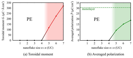 (a) Toroidal moment, G, and (b) averaged polarization, P, in SnTe nanoflake as a function of SnTe nanoflake size. The green dotted line indicates the polarization of the SnTe monolayer. PE indicates the paraelectric phase.