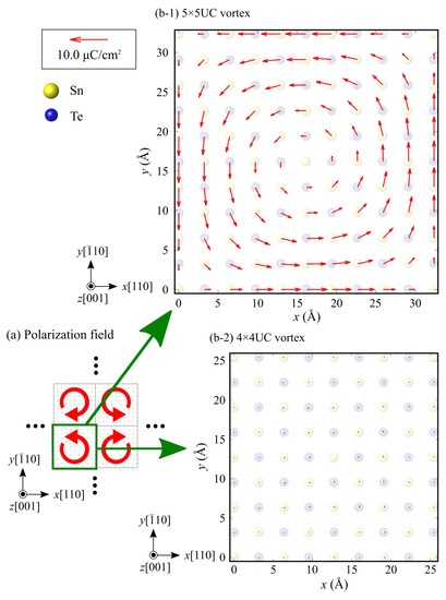 In the following, we discuss the appearance of critical dimension of the vortex polarization in the SnTe nanoflakes. As discussed in Section 3.1, the factors that cause the size effect and critical dimension appear are: (i) the electrostatic effect, due to the formation of a depolarization field [16,35], and (ii) the reconstruction and rearrangement of the atomic and electronic structure due to a lower coordination number at a surface or edge [36,37,38]. In order to examine the effect of these factors, we calculate an imaginary model of an edge-free SnTe monolayer with a vortex polarization that is the same as the nanoflakes, as shown in Figure 9, and compare the results. This model consists of periodically arranged clockwise and counterclockwise polarization vortices in a SnTe monolayer, and each polarization vortex mimics a nanoflake with a vortex polarization but without any edge structures. Since this imaginary edge-free SnTe monolayer model is free from the edge and the resulting (coinciding) electrostatic depolarization field and dangling bonds, through comparison between the SnTe nanoflakes and this imaginary edge-free model, one can extract how the existence of edge and electrostatic field and/or dangling bonds affect the ferroelectricity of the SnTe nanoflakes. Figure 10 shows the calculated local polarization field of the imaginary edge-free SnTe models with polarization-vortex periodicity of 5 × 5 and 4 × 4 unit cells. The edge-free SnTe model with a 5 × 5 unit cell size exhibits a quasi-stable vortex polarization, as shown in Figure 10a, which is almost same as that observed in the 5 × 5 SnTe nanoflake, as shown in Figure 7. On the other hand, no spontaneous polarization is observed in the edge-free SnTe model with a 4 × 4 unit cell or less (Figure 10b). This is also consistent with the absence of polarization and paraelectric nature of the 4 × 4 SnTe nanoflake. These results indicate that the presence or absence of edges does not affect the appearance of a ferroelectric critical size of SnTe nanoflakes. Therefore, the effects of factors (i) the depolarization field and (ii) the dangling formation at the edges are not the primary causes of the disappearance of the vortex polarization in the SnTe nanoflakes. The situation of the SnTe nanoflakes is clearly different from that of the conventional ferroelectrics, where the critical size appears due to these two factors.