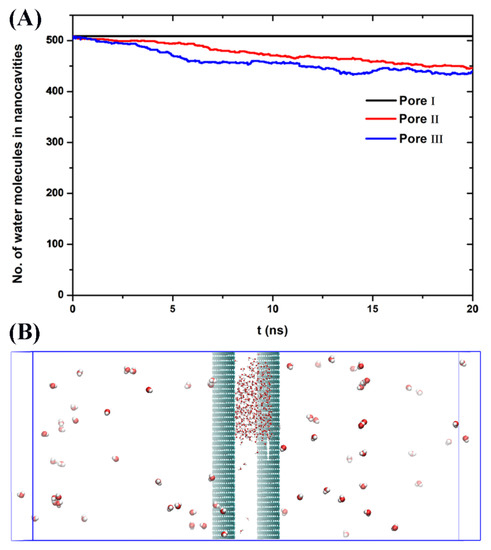 In spite of the hydrophobic nature of nonpolar nanocavities, however, water can be adsorbed inside these hydrophobic nanopores without the application of a high-pressure [1,2,3,4]. So far, a series of experimental and theoretical studies have demonstrated that nanocavities in single-wall carbon nanotubes (SWNTs) and graphene walls can encapsulate water molecules [5,6,7,8,9,10]. Many studies on water in these nonpolar nanocavities have mainly focused on the structures and thermodynamic properties which are fundamentally different from bulk water [11,12,13,14,15]. For example, water confined nanopores can form unique ordered ice and exhibit anomalous diffusion or transport behavior [10,11,12,13,14,15,16,17]. On the other hand, the understanding of water dewetting in nanoporous materials is also significant in various fields including nanomaterial drying, oil recovery, soil remediation, energy conversion, storage applications, and protein folding [18,19].