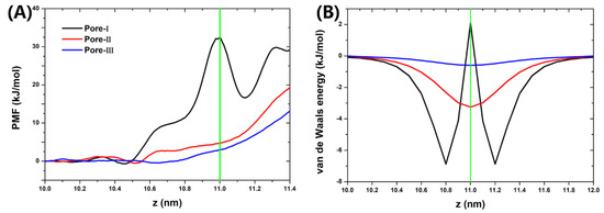 Potential of mean force (PMF) profiles of water passing through the nanopores of graphene along the z-axis (A). The van de Waals energy between the water and the graphene nanopore (B). The green vertical lines represent the position of graphene walls. For PMF profiles, the z < 11.0 nm region represents nanocavities containing water droplet, and the z > 11.0 region represents the vacuum chamber.