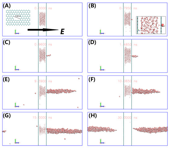 To gain more insight into the electric field-induced dewetting, the snapshots for Pore I at 3.0 V/nm are presented in Figure 5. The water droplet is confined between two graphene walls in absence of electric field (Figure 5A). When the electric field E = 3.0 V/nm is applied, water molecules are removed rapidly though the Pore-I into the vacuum chamber. The water molecules form a single chain when only few water molecules enter vacuum chamber (see Figure 5C). The water chain is consistent with the water cluster structures induced by electric field [55,56]. With the number of water molecules in vacuum chamber increasing, the chain transforms into a longitudinal water column (Figure 5D–H), similar with the structure that water droplet elongated under electric field [47,57]. When almost all the water molecules enter vacuum chamber, the water column separates from the graphene wall (Figure 5H). The threshold field value of 1.5 V/nm for the formation of water column in case of Pore-III (weak van der Waals interaction between water and graphene wall) agrees with the value of 1.2 V/nm for water droplet on the Pt surface [47]. And it requires a threshold field value of >1.5 V/nm for Pore-I and Pore-II duo to the strong van der Waals interaction between water and graphene wall.