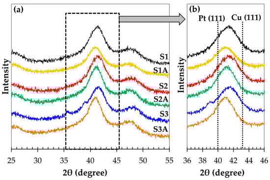 (a) X-ray diffraction patterns of the “as-prepared” S1, S2, S3 PtCux/C and de-alloyed S1A, S2A, S3A PtCux−y/C catalysts. (b) In the inset (on the right)—an enlarged fragment of the diffractogram area, highlighted by the dotted line in Figure (a).
