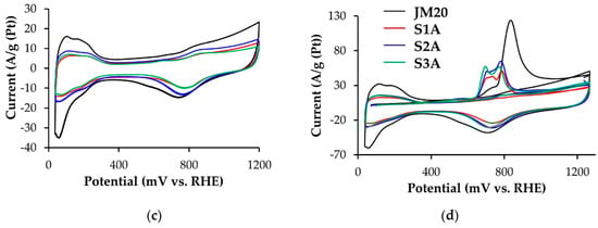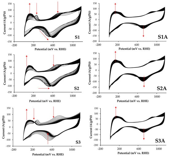 The behavior of the initial and de-alloyed catalysts in the process of electrochemical standardization has significant differences. CVs of S1–S3 samples during the first few cycles show anodic maxima in the potential range 0.25–0.35 V, associated with the dissolution of copper from the intrinsic phase (Figure 2) [,]. For the samples of de-alloyed catalysts S1A–S3A, similar maxima on CVs were not observed. It should be noted that the materials surface development in the “as prepared” state continues during a greater number of cycles than for catalysts treated in acid (Figure 2). This indirectly indicates a long-term reorganization of the nanoparticles surface, due to a more intensive anodic dissolution of copper atoms. According to the published data [,], the anodic dissolution of copper from the Pt–Cu solid solution mainly occurs in the potential range 0.60–0.85 V and is reflected by a gradually decreasing local maximum on the CVs at the above potentials (Figure 2, samples S1–S3).
