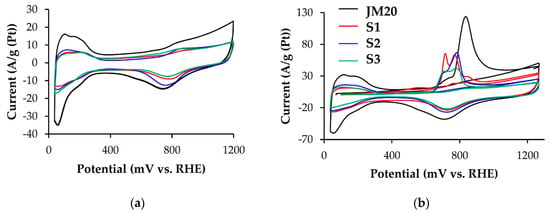 It is well known that the ECSA values and the values of the catalyst activity depend on the composition, structure, and method of the catalytic layer deposition [,,,]. Therefore, the electrodes, on which similar catalytic layers were formed by the same method but with commercial Pt/C HiSPEC3000 and HiSPEC4000 (Johnson Matthey, Swindon, UK) electrocatalysts containing 20% and 40% wt. platinum, respectively, were used as the reference samples.