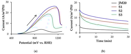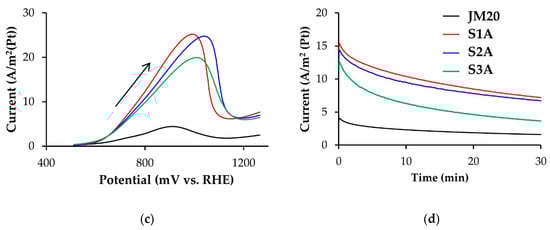 The same is true for the maximum currents of methanol oxidation on CVs: for bimetallic catalysts they are essentially higher than for Pt/C (Figure 4 and Table 2). The potentials for the onset of methanol oxidation, determined for platinum-copper catalysts by the corresponding CVs of the forward scan, are approximately 150–200 mV less than for commercial Pt/C. Despite a considerably higher methanol oxidation rate and, possibly, a higher concentration of intermediate reaction products on the electrode surface, platinum-copper catalysts, as a whole, showed higher current values when chronoamperograms were recorded at the potential of 0.7 V (Table 2, Figure 4b,d) compared to Pt/C. Together with a lower oxidation potential of a monolayer of chemisorbed CO (Figure 3b,d), this indicates a higher tolerance of bimetallic catalysts to intermediate products of methanol oxidation. The least activity in MOR was demonstrated by S3 and S3A catalysts.