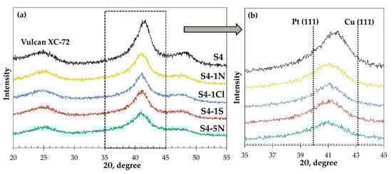 The X-ray diffraction patterns of platinum-copper materials contain reflections corresponding to the phases of carbon and platinum (Figure 1). In this case, platinum characteristic reflections are shifted toward large values of the 2 theta angles, this being a consequence of a Pt–Cu solid solution formation. A significant difference in the composition of the initial S1–S3 samples had practically no effect on the position of the characteristic reflections of the X-ray diffraction pattern, in particular, on 2 theta angles of the characteristic maximum 111 (Table 1, Figure 1b). Apparently, a larger or a smaller fraction of copper in these samples is contained in X-ray amorphous oxides [], while the composition of the metal component of various catalysts is indeed similar. At the same time, the 2-theta angle of the maximum 111 in the diffraction patterns decreases with the transition from the starting materials (S1, S2, S3) to the de-alloyed catalysts obtained from them (Table 1, Figure 1). This indicates a decrease of the copper content in the catalysts metal component and correlates with the obtained results, when their composition was determined (Table 1).