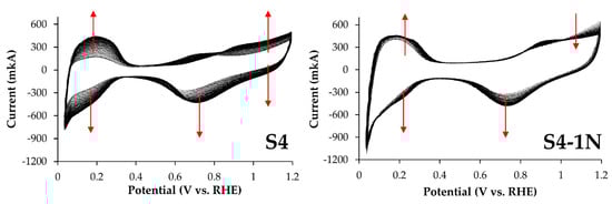 CVs of the initial (S4) and acid-treated electrocatalysts recorded during standardization have the form characteristic of platinum nanoparticles or its alloys deposited on a carbon support (Figure 7) [,,]. In the hydrogen region of CV (0.03–0.3 V), a gradual increase in currents is observed due to the cleaning and development of the surface of the PtCu/C materials, as was noted above (Figure 7). Moreover, there are no peaks in the potential range 0.25–0.35 V associated with the dissolution of copper from the intrinsic phase [,] on the anode CV branches of the initial (S4) and all de-alloyed PtCu/C materials (Figure 7). This indirectly indicates the absence of direct contact of the copper phase with the electrolyte. Note that the development of the surface of sample S4 (“as prepared” state) is much more pronounced (continues for a larger number of cycles) than for PtCu/C catalysts treated in acid (Figure 7). Obviously, this is largely due to a more intense anodic dissolution of copper atoms. The differences in the character of changes in the anode part of CV observed for S4, as compared to de-alloyed catalysts at potentials of about 1 V (Figure 7), are also apparently due to a significant difference in the surface composition of nanoparticles.