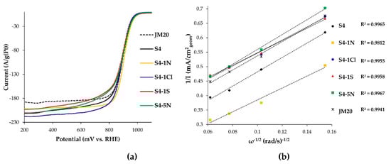 (a) LSV curves of electroreduction of oxygen on different catalysts. Disk rotation speed of 1600 rpm. (b) Dependencies 1/I on ω−1/2 at a potential of 0.90 V. Samples: 1—S4, 2—S4-1N, 3—S4-1Cl, 4—S4-1S, 5—S4-5N, 6—JM20.