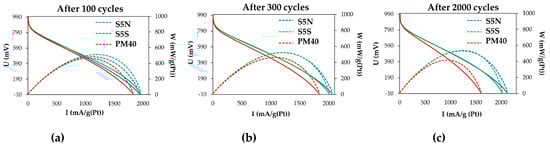 Polarization and power density curves of MEAs after 100 (a), 300 (b) and 2000 (c) stress testing cycles. Catalyst layers were prepared using PM40, S5N, and S5S catalysts. The loading of platinum in each catalytic layer was of 0.4 mg/cm2.