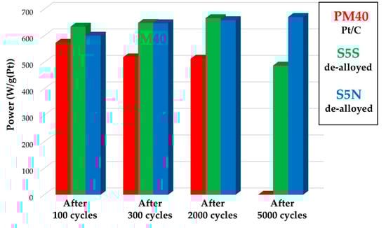 The maximum power of MEAs based on the studied PtCu/C and Pt/C catalysts after 100, 300, 2000 and 5000 cycles of stress testing in the membrane-electrode assembly.