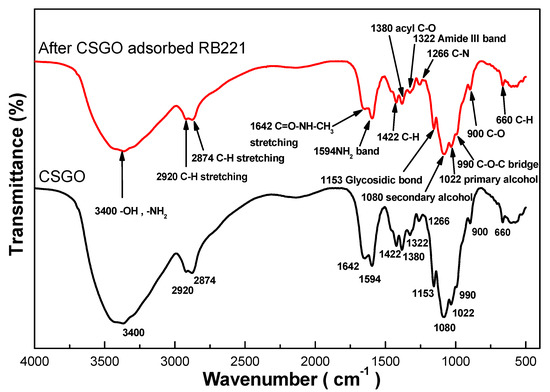 Figure 5 shows the changes in the IR spectra of CSGO before and after the adsorption of RB221. After the adsorption of RB221, the signal strengths at the characteristic peaks for the primary alcohol and secondary alcohol functional groups on the modified CSGO molecules were significantly reduced. The decreasing in signal strengths at the wavenumbers of primary alcohol (1022 cm−1), secondary alcohol (1080 cm−1), and glycosidic (1153 cm−1) functional groups indicate that adsorption bonds were formed at the corresponding positions. Additionally, the signals strength at the wavenumbers corresponding to the amide (2874 and 2920 cm−1) and amine (1642 and 3400 cm−1) functional groups were observed, indicating that a large amount of dye amine groups was adsorbed on CSGO, which confirmed the adsorption of RB221 by CSGO. Additional qualitative results for CSGO before and after the adsorption (obtained using infrared (IR) spectra) are presented in Table S4 (Supplementary Material). Furthermore, the fine distribution of the TFGO in the CS matrix was evidenced by the FE-SEM observation. The homogeneous distribution of TFGO platelet in the CS matrix is demonstrated (Supplementary Material Figure S6).