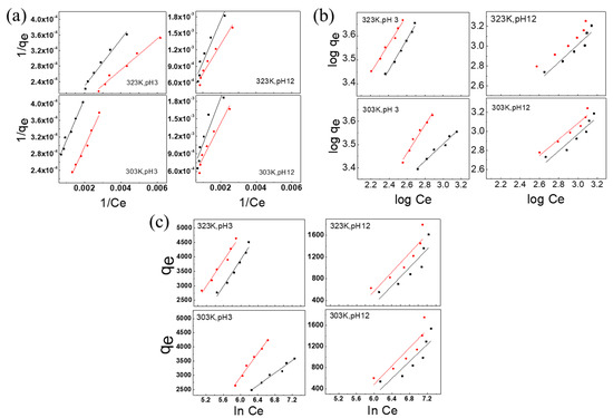 The isothermal adsorption mode of the adsorbent was tested at different adsorption temperatures: 303, 313, and 323 K. First, 0.25 g of the adsorbent and 25 mL of RB221 solution—with initial concentrations of 3000, 3400, 3800, 4200, 4600, and 5000 mg/L at a pH of 3.0, as well as concentrations of 1000, 1400, 1800, 2200, 2600, and 3000 mg/L at a pH of 12.0, respectively—were added to a reaction flask. Then, the suspensions were magnetically stirred at 800 rpm for 6 h and centrifuged for 15 min at 6000 rpm to separate the adsorbents from the aqueous solutions. The supernatants were extracted to measure the final residual concentration.
