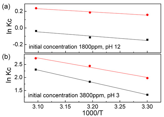 Thermodynamic experiments were conducted to study the adsorption of RB221 by different adsorbents at a pH of 12 and an initial RB221 concentration of 1800 mg/L and a pH of 3 and an initial RB221 concentration of 3800 mg/L. The thermodynamic parameters related to the adsorption process—such as the standard free energy change (ΔG0), standard enthalpy change (ΔH0), and standard entropy change (ΔS0)—were calculated using the van’t Hoff equations (Equations (12) and (13)) [41].