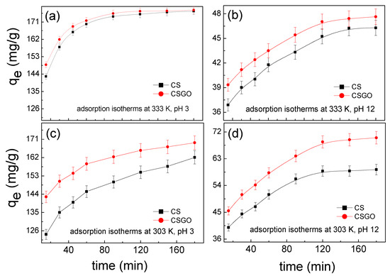 Time variation trends of the dye adsorption capacities of the two adsorbents at different pH values and temperatures: (a) pH 3 and 333 K, (b) pH 12 and 333 K, (c) pH 3 and 303 K, and (d) pH 12 and 303 K (■ CS, ● CSGO).
