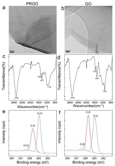 Characterizations of PRGO and GO. (a) TEM image of PRGO; (b) TEM image of GO; (c) IR spectrum of PRGO; (d) IR spectrum of GO; (e) C1s XPS spectrum of PRGO; (f) C1s XPS spectrum of GO.