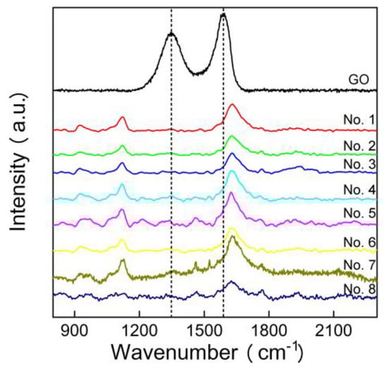 The first application of our method was to analyze the local water samples. We collected eight different water samples in Chengdu city (Table 1). The water samples were treated and measured following our protocols. In Figure 5, there was no meaningful graphene signal detected among all eight samples. There was no G band or D band peak observed in those spectra. The peak at 1620 cm−1 was attributed to water or excess hydrazine hydrate (Figure S1). This suggested that there was no graphene or GO in the aqueous environment, although Chengdu has been dedicated to developing a graphene industry for years. The absence of graphene in the aqueous environment indicated that graphene has not yet induced pollution in Chengdu city.