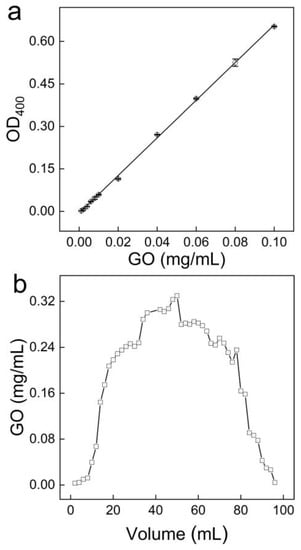 To investigate the transport behaviors of GO in a quartz sand column, the quartz sand was carefully washed with water and dried at 60 °C overnight before use. The sand was packed into a glass column (diameter of 1.5 cm, length of 12 cm) and dampened with water. The column was operated in a downward direction. After the equilibrium with the water, the water was replaced with the GO dispersion (0.25 mg/mL) as the mobile phase. The eluent was collected at 2 mL each, for GO concentration determination following the protocol in Section 2.2. After reaching the plateau, the mobile phase was replaced with water.