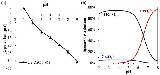 (a) Cr(VI) species distribution diagram for a total Cr(VI) concentration of 10 mg L−1 in water; (b) ζ-potential for Ce-doped zirconia.