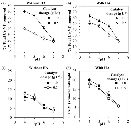 In the presence of humic acid (Figure 5b), for the catalyst dosage of 0.5 g L−1, higher Cr(VI) total removal percentages were obtained in comparison with the systems without HA (Figure 5a), but for the catalyst dosage of 1.0 g L−1, the presence of HA did not change significantly the Cr(VI) total removal. The important effect of HA was to increase the percentages of the Cr(VI) removed by photocatalytic reduction (Figure 5c,d) for both catalyst dosages. In addition, when HA was present, the Cr(VI) photocatalytic reduction was less affected by the pH and the catalyst dosage.
