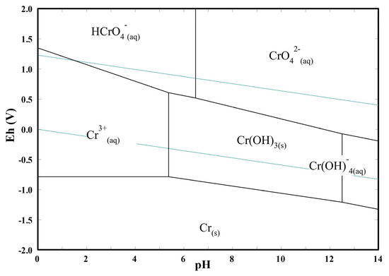 The Eh–pH (Pourbaix) diagram for the system Cr–H2O was generated using the HSC Chemistry 6.0 (Outokumpu, Helsinki, Finland) software. The stability areas of the Cr species were calculated considering the reduction potentials and equilibrium constants provided by the software at the temperature of 25 °C and for a total Cr(VI) concentration of 10 mg L−1.