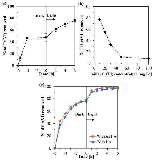 In Figure 4, it can be observed the total removal of Cr(VI), i.e., combined effects of adsorption in the dark and photocatalytic reduction. The adsorption was discussed in the previous section. Now, in order to understand the contribution of the Cr(VI) photocatalytic reduction and the effects of pH and HA, each parameter is going to be studied separately.