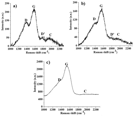However, it must be highlighted that it is only the top few surface layers of each coating are analyzed. Therefore, any study of the spx ratios and discussion relating these values using XPS data will represent only the surface values, and not necessarily those of the entire volume of the thin film. This observation implies that the results for Cu-C15 thin film correspond to almost all the thickness of the coating, whereas for Cu-C100 the analysis corresponds to about 1/10 of the coating thickness. Considering that the tribological tests, due to the experimental conditions especially the macro load, will be influenced by the total amount of the carbon thin films, additional characterization was performed. Therefore, the entire volume of the three carbon thin films was evaluated by micro-Raman spectroscopy (Figure 4).