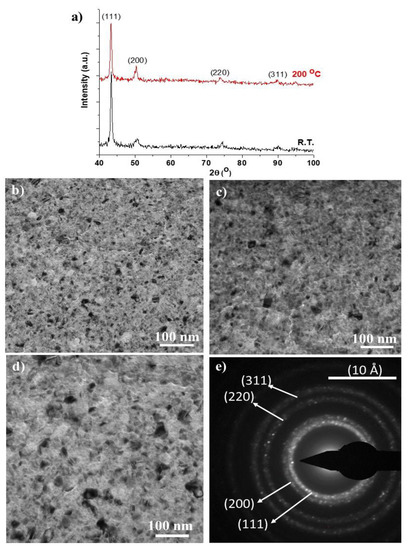 The structural evaluation of the Cu thin film was made by XRD and TEM (Figure 5). In Figure 5a the X-ray diffractograms, at room temperature and 200 °C, show evidence of a preferential orientation according to the (111) diffraction plane. This can be quantified by the ratio between the intensity of the (111) and (200) diffraction planes (I111/I200) and comparison with the same ratio of the copper ICDD reference card no. 83-1326. The ratio is 2.3 for the reference card, 8.2 in the deposited thin film and 7.8 after 24h at 200 °C. The preferential growth of the (111) diffraction plane is known to occur in certain deposition conditions for materials with faced center cubic (fcc) crystallographic structures [32]. The (111) corresponds to the plane of highest atomic density in the fcc structure, and also the lowest surface energy, thus implicating that the reactivity of the surface is low and that the diffusion of reactive species, such as oxygen, is more difficult. Therefore, the oxidation resistance of the coating material can be significantly higher than the correspondent 3D material or thin films without any preferential crystallographic orientation. Moreover, the width of the diffraction peaks indicates a nanocrystalline material. Characterization through TEM confirmed that the as-deposited coatings (Figure 5b,e) are nanostructured.